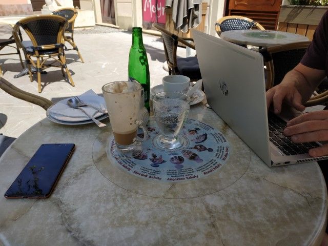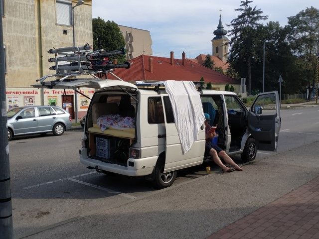 Wir schlendern durch die Stadt und gönnen uns noch einen Langos mit Sauerrahm und Käse. Zufällig ist Jaci‘s Mum in Györ. Wir treffen uns mit Renate und Janos (Jacis Mum und ihr Freund) in einem Cafe. Da wir doch den ein oder anderen Gegenstand mitgenommen haben, den wir nicht benötigen, überreichen wir den Beiden zwei volle Sackerl mit Dingen, die doch nicht notwendig sind.