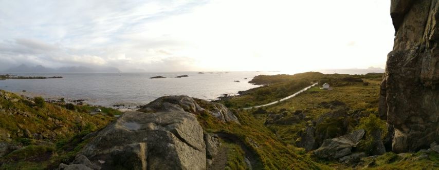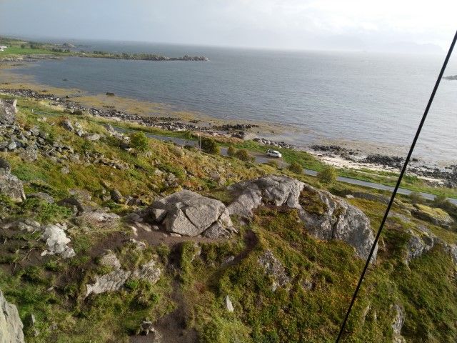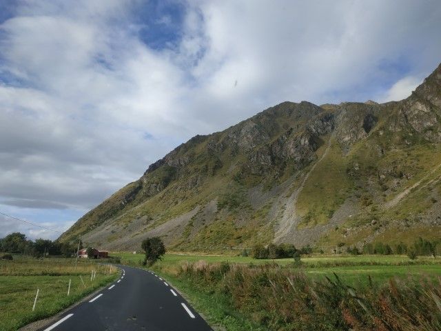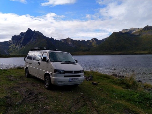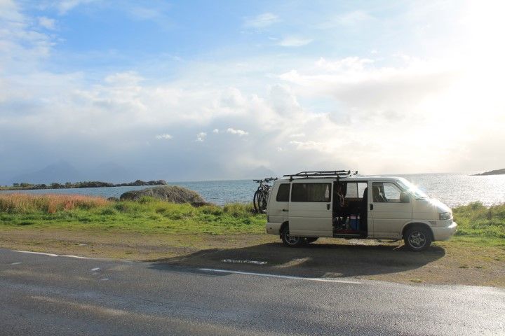...und kommen auf die Sekunde zum Einfahren in die Autofähre in Melbu. Wir übersetzen nach Fiskebol. An einem Fjord finden wir ein schönes Plätzchen für die Nacht. Leider ist es ganz schön schief und wir verbringen eine unruhige erste Nacht auf den Lofoten.