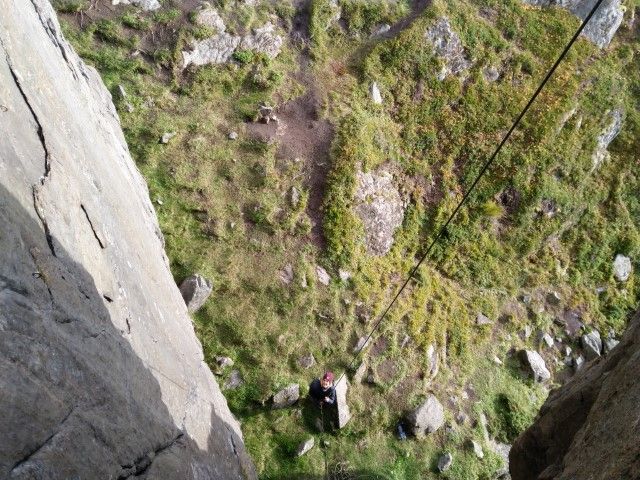 Beim letzten Zug vor dem Top gibt es einen Straußenei großen Wackelstein und ich verzichte aufs fertigklettern. Mit einer kleinen Abseil-Aktion von oben; holen wir dann das in der Wand gebliebene Material wieder ein.