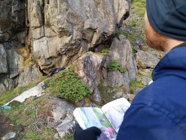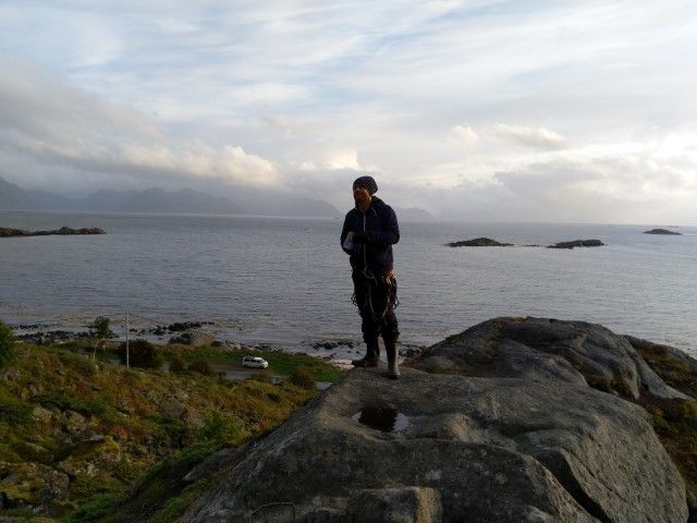 Die Trollskȧla ist unser erwähltes Gebiet und wir haben ein irrwitziges Glück. Zwischen den sichtbaren Regenfeldern gibt es einen Sonnenstreifen, der den Kletterfelsen abdeckt.