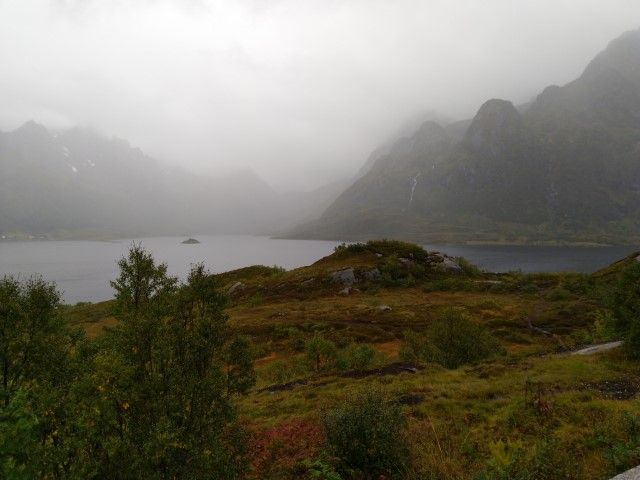 Wir sind beeindruckt von dem Landschaftsbild der Lofoten, schade nur das es immer wieder in Nebelschwaden und Regenwolken versinkt.