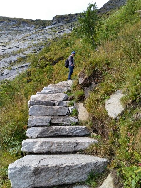 Heute steht wieder mal eine Wanderung am Plan und zwar die must-have-done Wanderung der Lofoten: Reinebringen. Aber eins nach dem anderen. Zuerst Frühstücken wir und schreiben eine Einkaufsliste, dann fahren wir noch einmal nach Å und hoffen in der vom Internet empfohlenen Bäckerei Süßspeisen zu erstehen. Die Bäckerei ist für die Saison geschlossen. Zumindest Briefmarken bekommen wir. Wir fahren zum Einstiegspunkt der Wanderung. An der Parkplatzsituation merkt man wie beliebt sie ist, aber zu unserem Glück fährt gerade jemand aus einer Lücke.