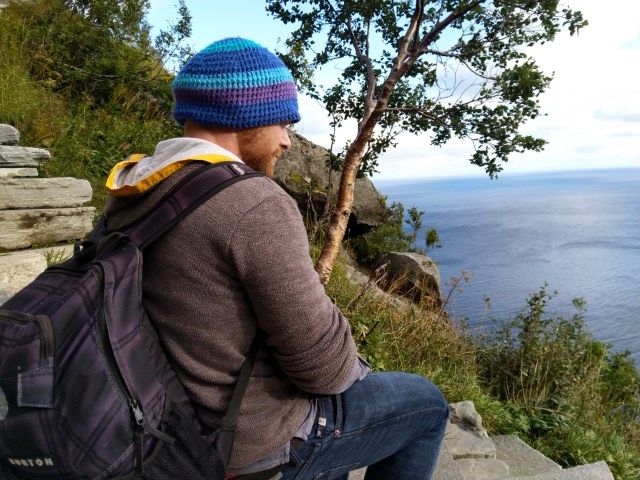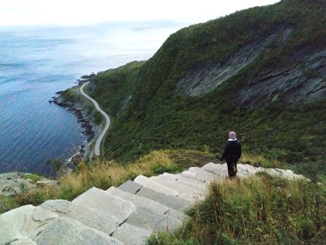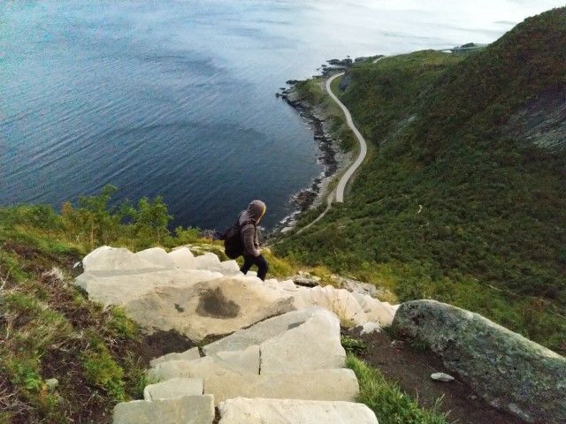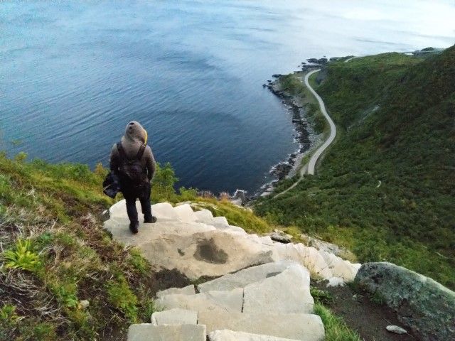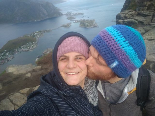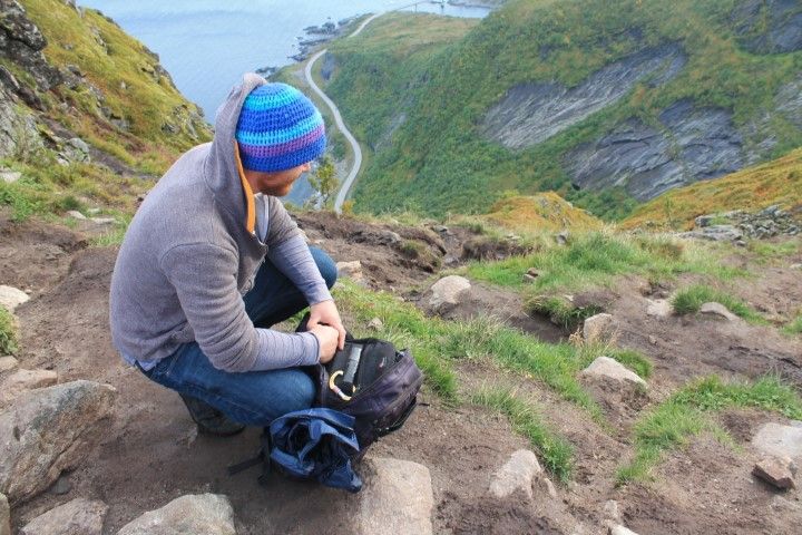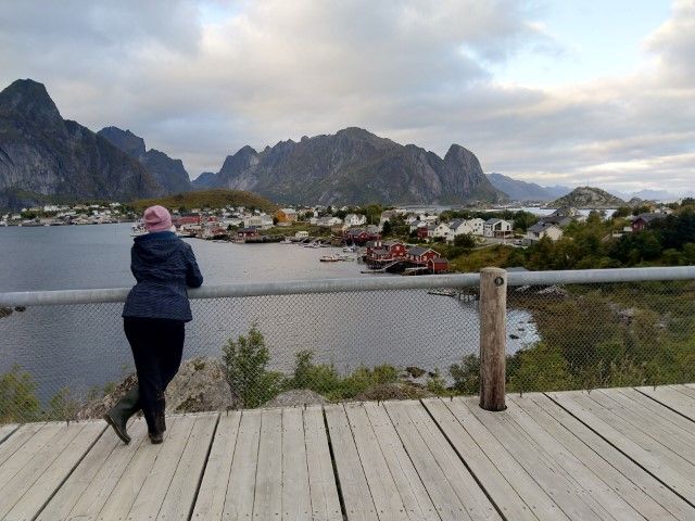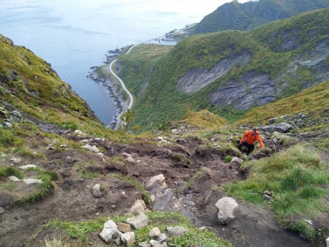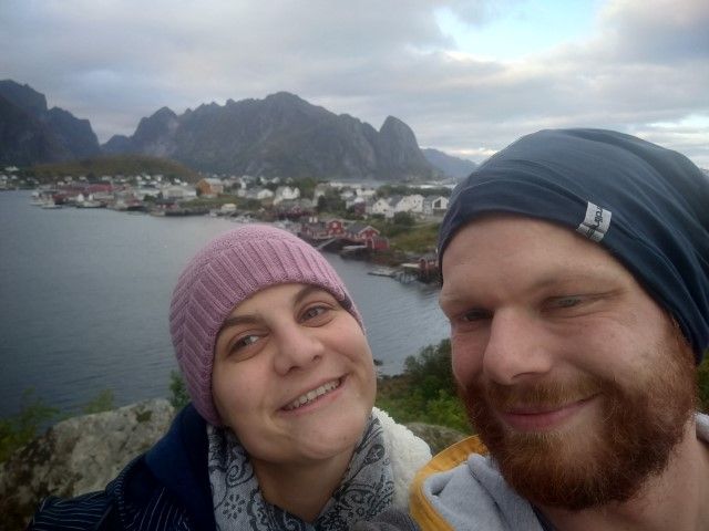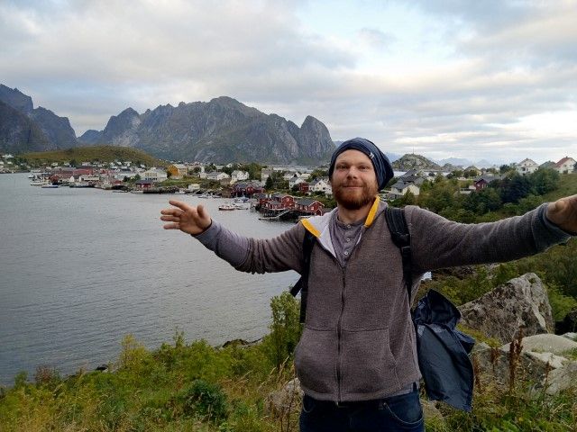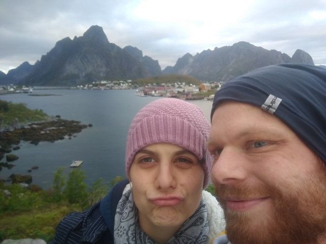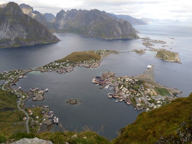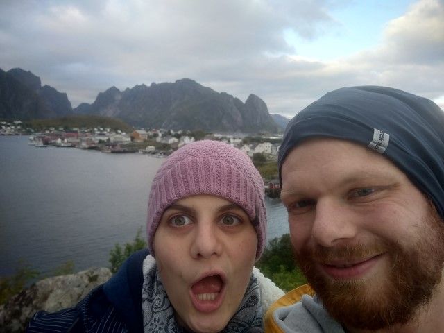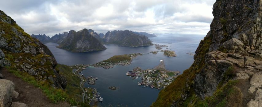 „Um Himmels willen“ kommt aus meinen Lippen, als ich am Kamm stehe. Denn der Ausblick ist phänomenal. Auch ziemlich beängstigend. Wir machen Bilder und bestaunen das Panorama, das sich vor uns bietet. Man sieht über die gesamte Insel Reine und die dazugehörenden Bergketten, die es umschlingen.