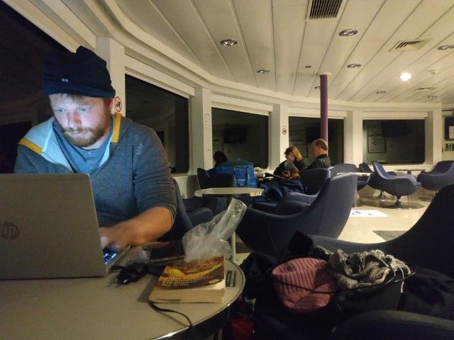Mit unseren sieben Sachen machen wir es uns in ein paar Sesseln bequem und genießen die Überfahrt.