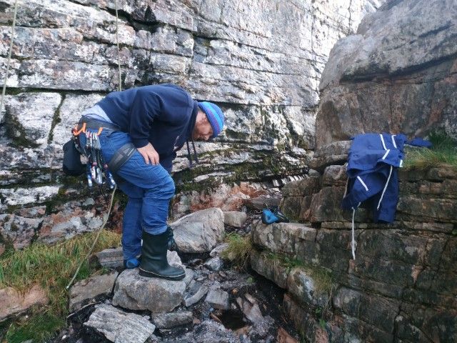 Ich entscheide mich dafür den Zustieg zweimal zu gehen, da ich das Wasser im Bus liegen gelassen habe. Passiert den Besten. Die Kroone der Kompensation bereitet derweilen alles zum Klettern vor und ohne Umschweife steigen wir ein.