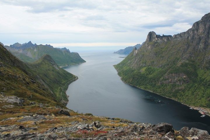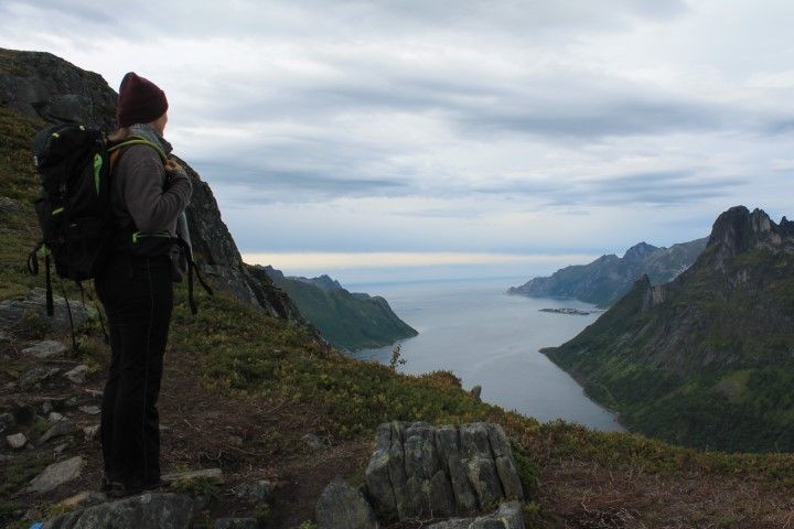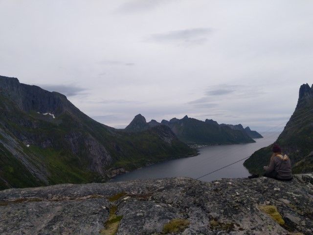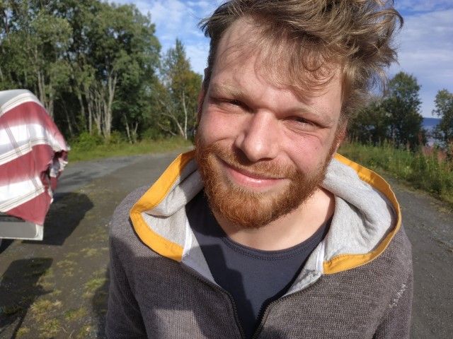 Unten angekommen reinigen wir unsere Kleidung in einem Bach und waschen uns im Bus. Während der Waschaktion bemerken wir, wie hungrig wir sind und machen uns auf den Weg einen Platz zum Kochen und für die Nacht zu suchen. Auf dem Weg halten uns zwei Autostopperinnnen auf. Ein Mädchen aus Dänemark und eines aus den Niederlanden. Sie beide studieren in Tromsø und müssen zum Fährhafen in Botnhamn, um ebendahin wieder zurückzukehren. Wir nehmen sie mit und plaudern über dies und das. Anschließend finden wir einen perfekten Platz auf dem Weg nach Husøy, die Stadt, die wir uns morgen anschauen wollen. Finally fangen wir zu kochen an, hängen unsere Wäsche draußen zum Trocknen auf und essen gegen 23:00 Uhr. Danach noch eine Partie Memoarrr und ab ins Bett.