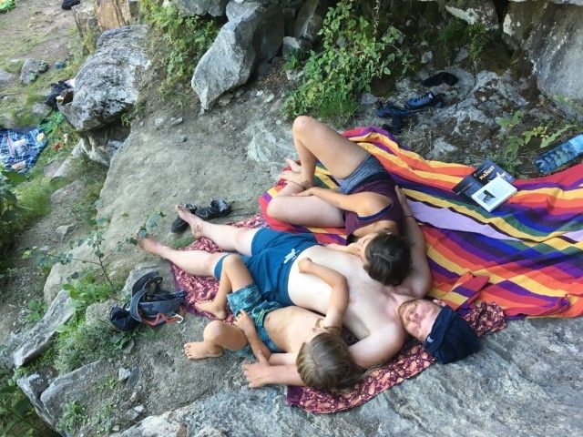 Ein Tag voller körperlicher Betätigung tut gut und nach dem Felsgenuss fahren wir retour zum See. Wir schlagen uns die Bäuche voll...