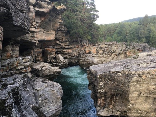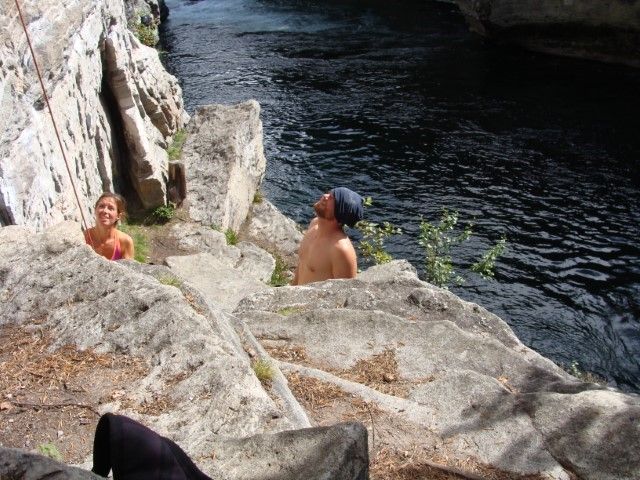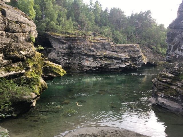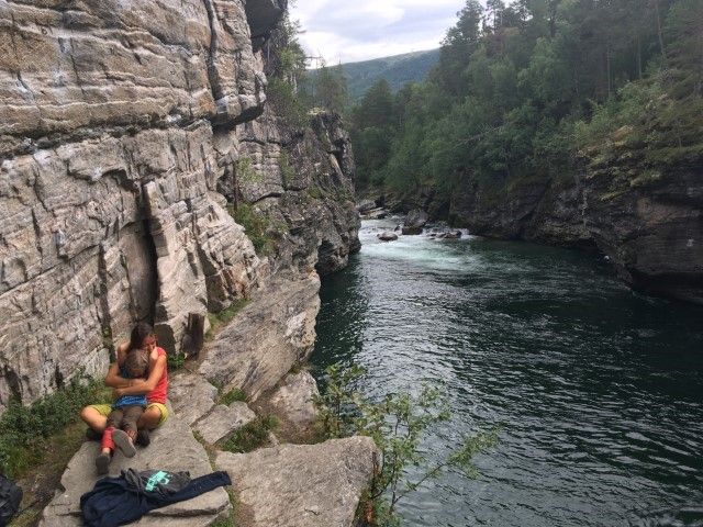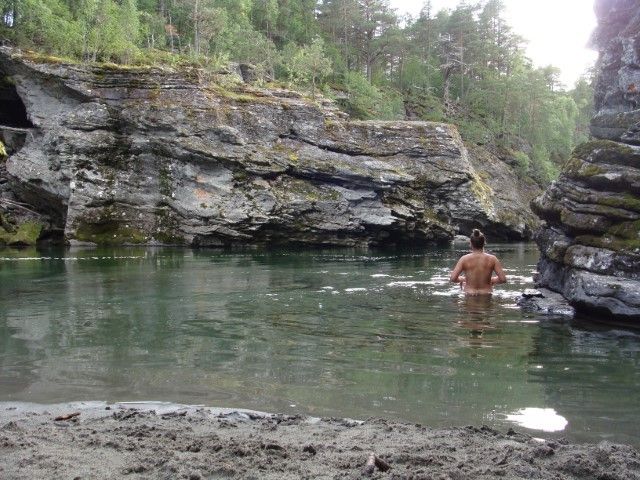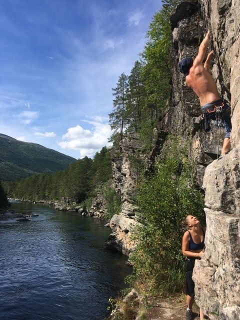 Nach dem unsere Unterarme durch sind und kein Zug mehr geht, lassen wir es. Oppdal war eine Kletterfreude und wir nehmen, bevor wir weiterfahren noch ein Bad im Fluss und trinken noch ein Bier.