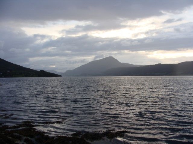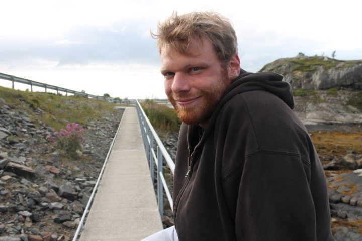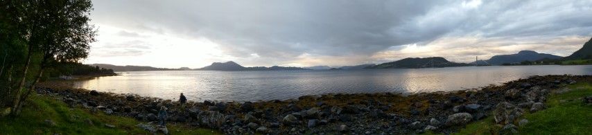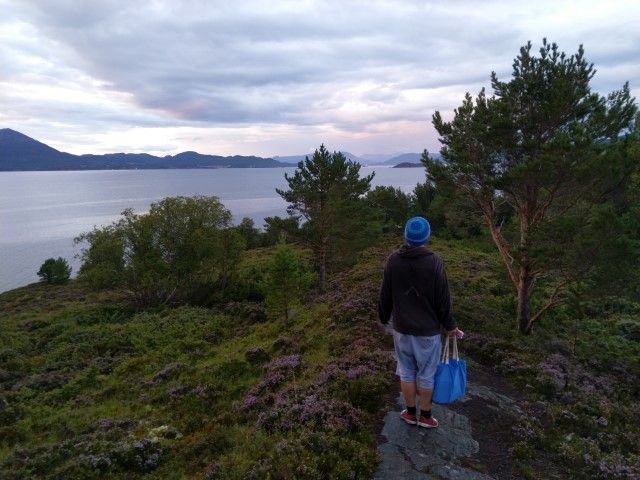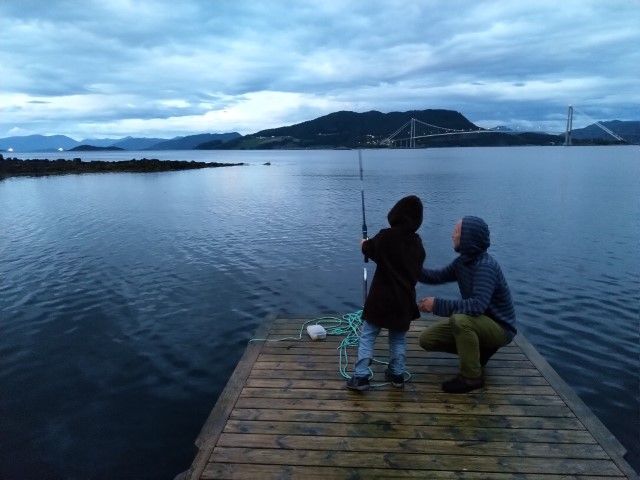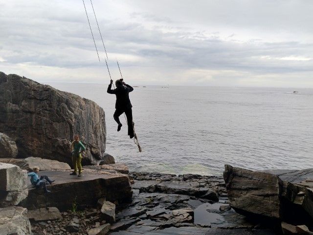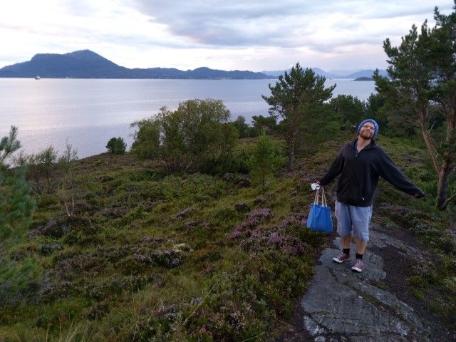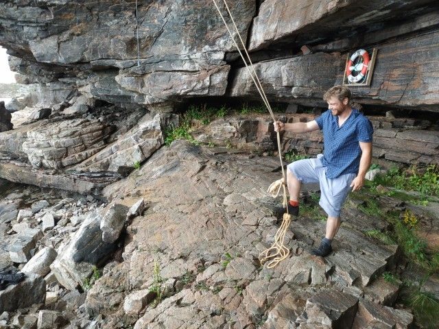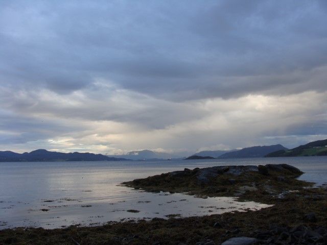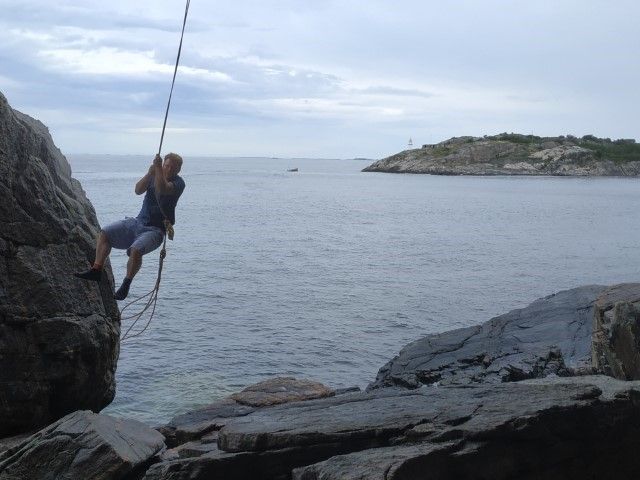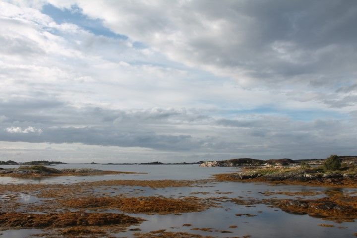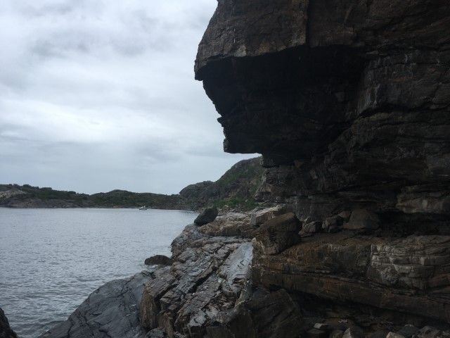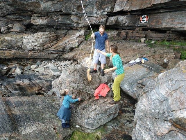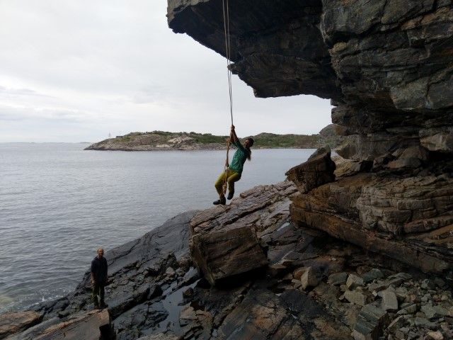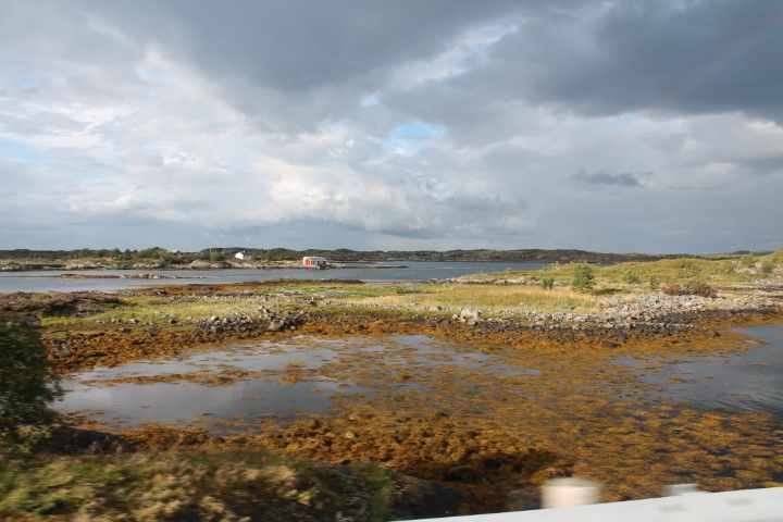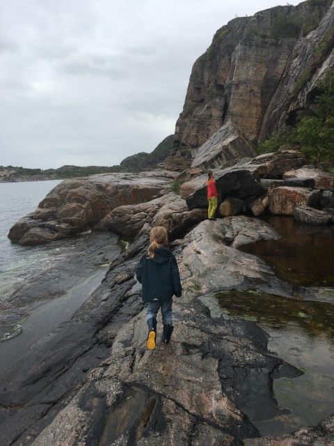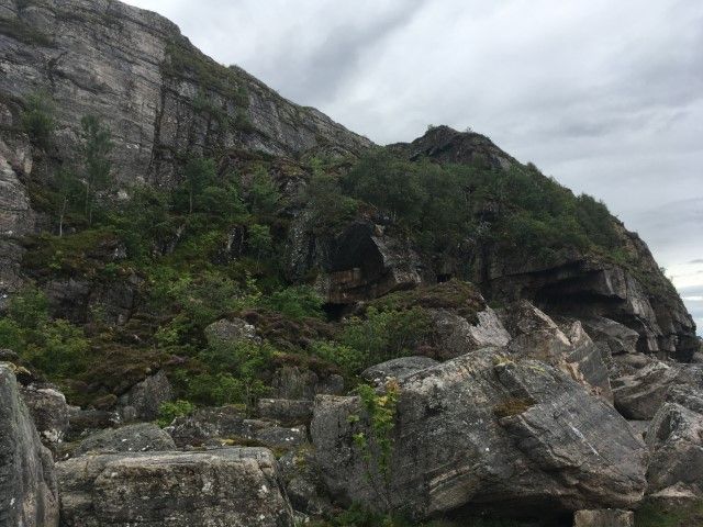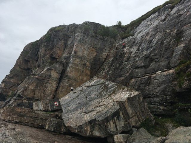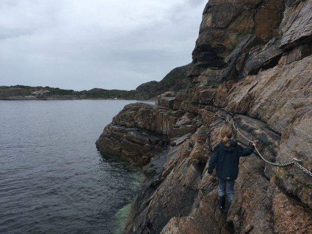 Das Wetter verbietet uns heute klettern zu gehen. Der Regen ist zuviel und eine nasse Wand macht einfach keine Freude. Wir wollen die Wände, die "Kvitnes" zu bieten hat aber trotzdem ansehen und machen deshalb einen Spaziergang am Wandfuß. Die Umgebung vor dem Klettergebiet ist beeindruckend hässlich, lauter idente Häuser ohne grün im ganzen Ort. Die Klippe unter der Siedlung, die das Klettergebiet bildet, überrascht dann aber mit Schönheit am Meer.