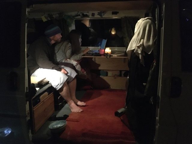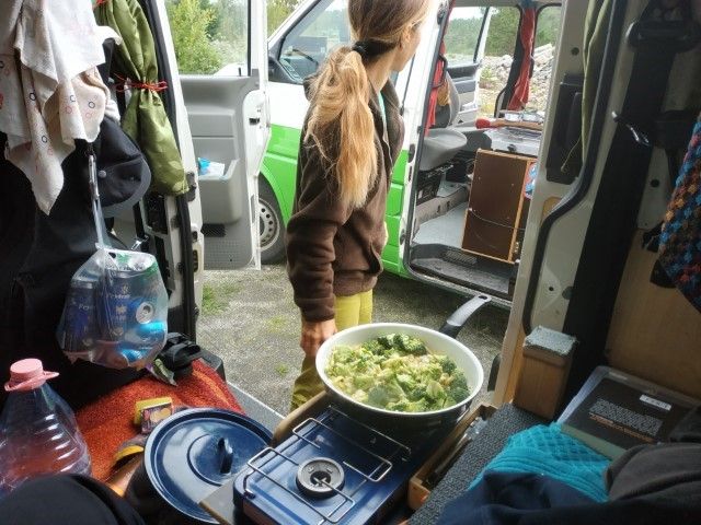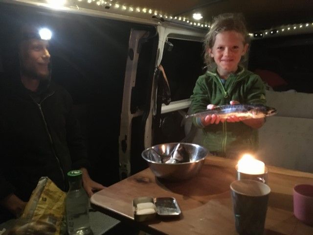 Wir haben die Zeit übersehen… Zwischen den Bussen, im Regen grillt Bene die Makrelen in der Pfanne, damit es in den Bussen nicht stinkt. Als das Essen fertig ist, ist es schon nach Mitternacht. Alle zusammen verspeisen wir die Fische dann aber hurtig ins Bett mit uns.