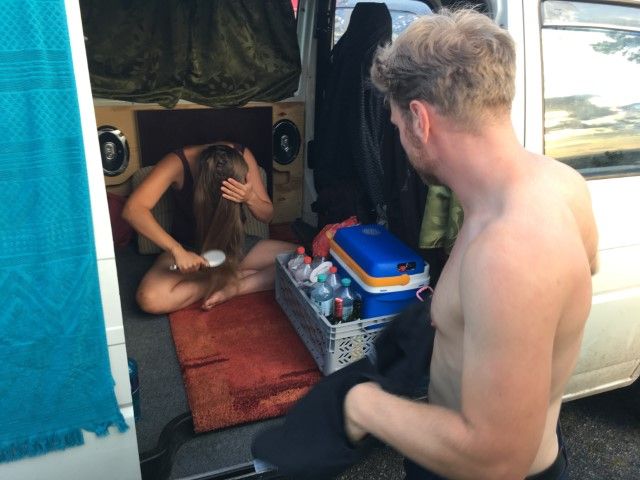 Nach dem Frühstück geh ich mit Suri und Jonathan abwaschen. Der Abwasch wird - da der Strand relativ steil ist - akrobatisch. Suri wäscht das Geschirr einzeln unten am Wasser und schupft es mir hoch zum Abtrocken, zeitgleich schupf ich ihr zu Waschendes hinunter. Es funktioniert so gut, dass wir sogar das zerbrechliche Marmeladenglas riskieren.