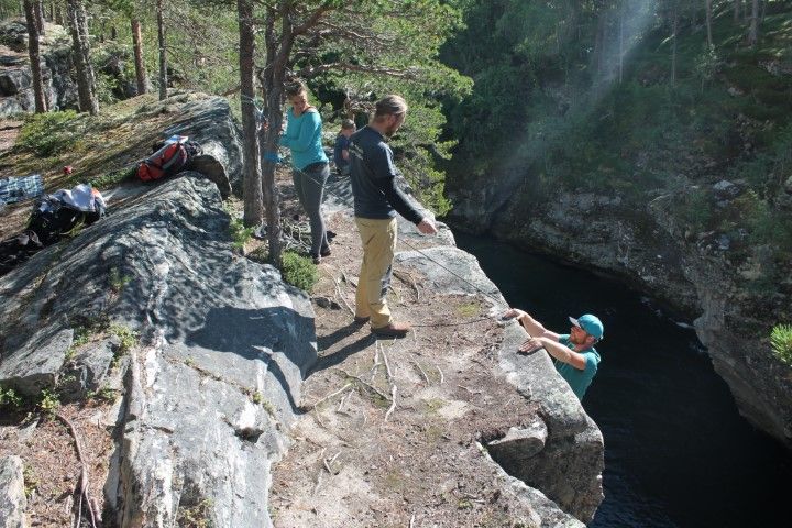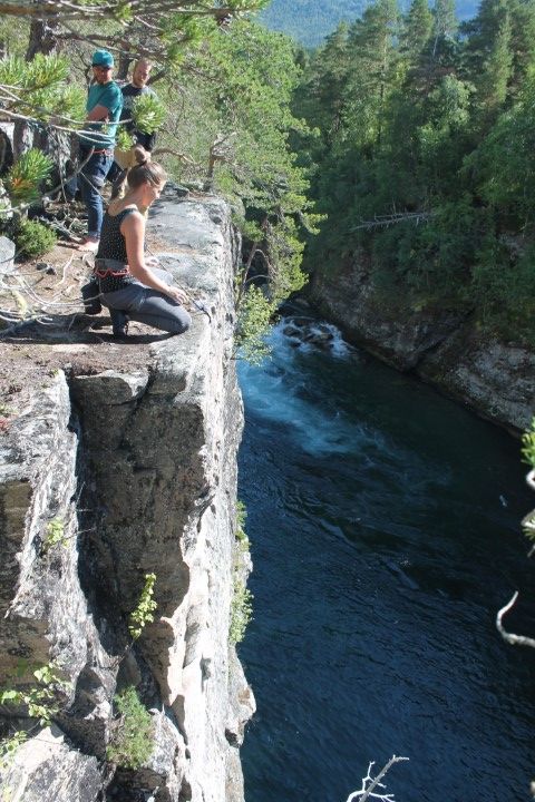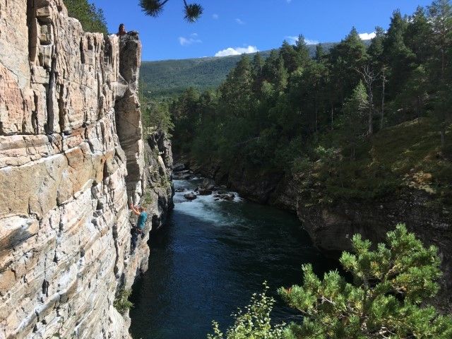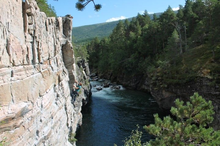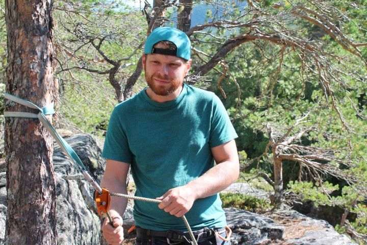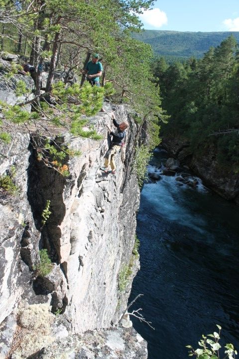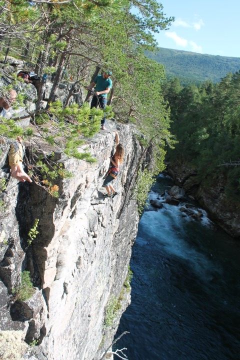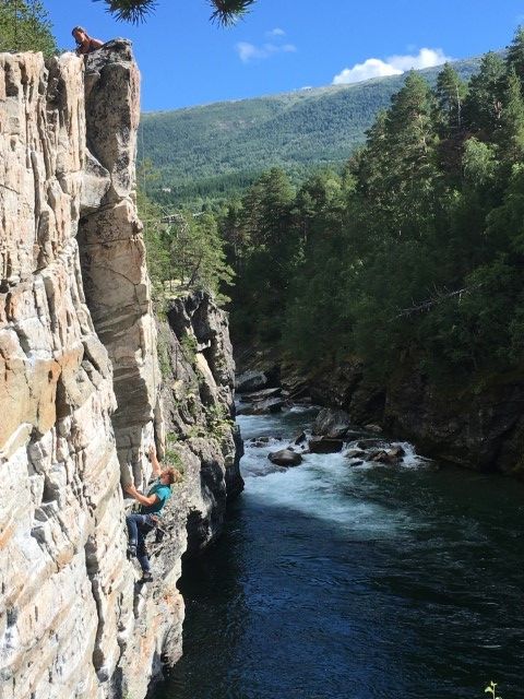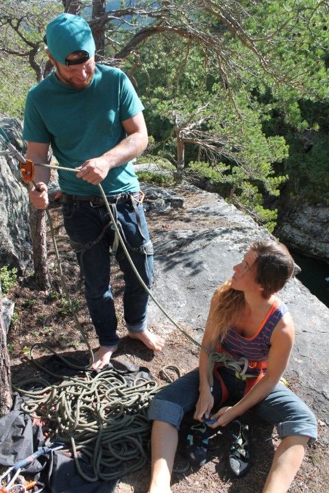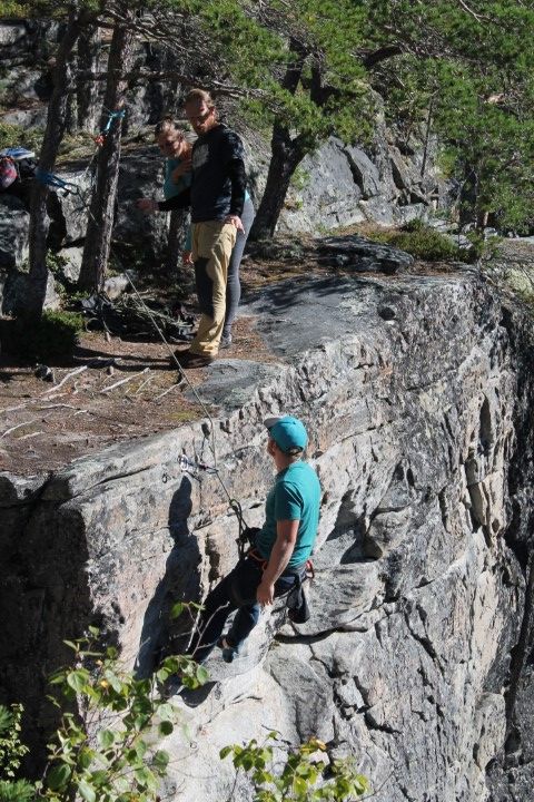 Oppdal hat neben den zahlreichen Routen, die wir schon geklettert haben noch einige, die ein bisschen spezieller sind, da man von oben abseilt und sie dann Toprope geht. Zu diesem Zwecke zeigen uns Bene und Surya noch, wie man mit einem Reverso von oben sichert und wir probieren das auch gleich aus.