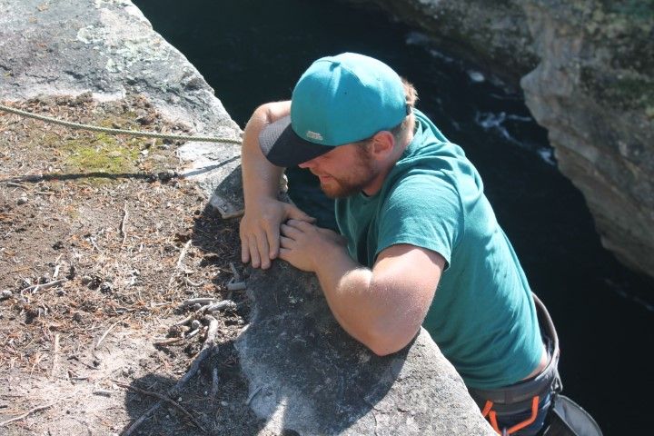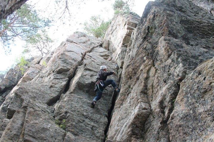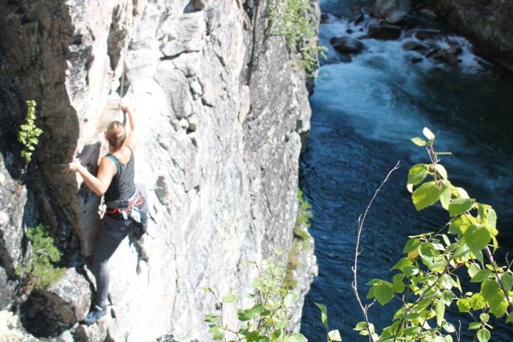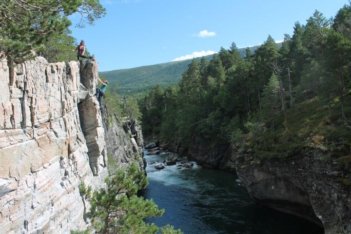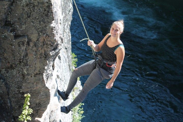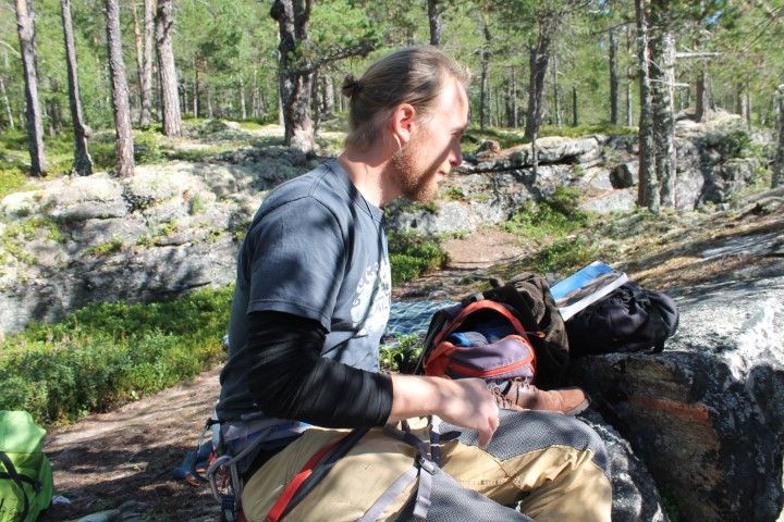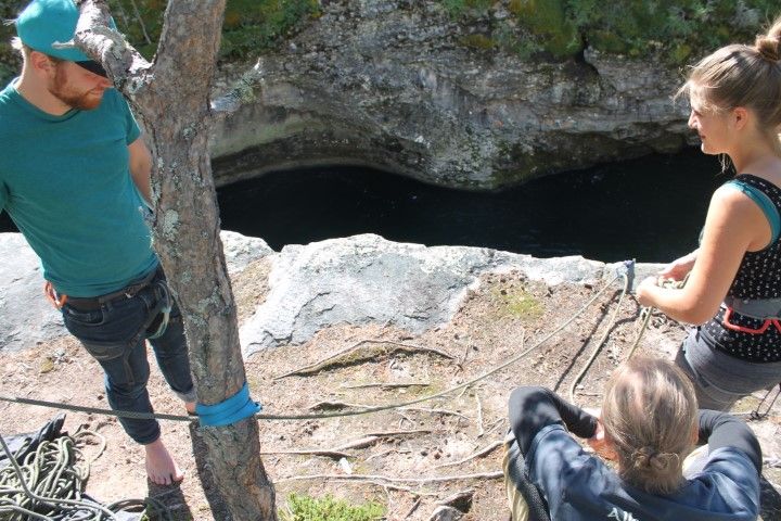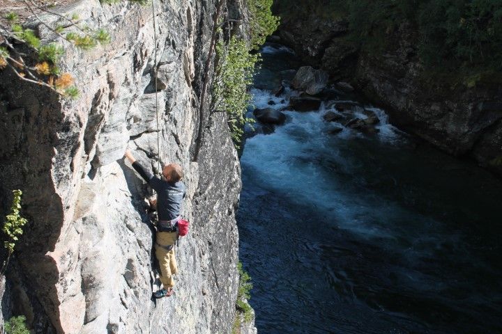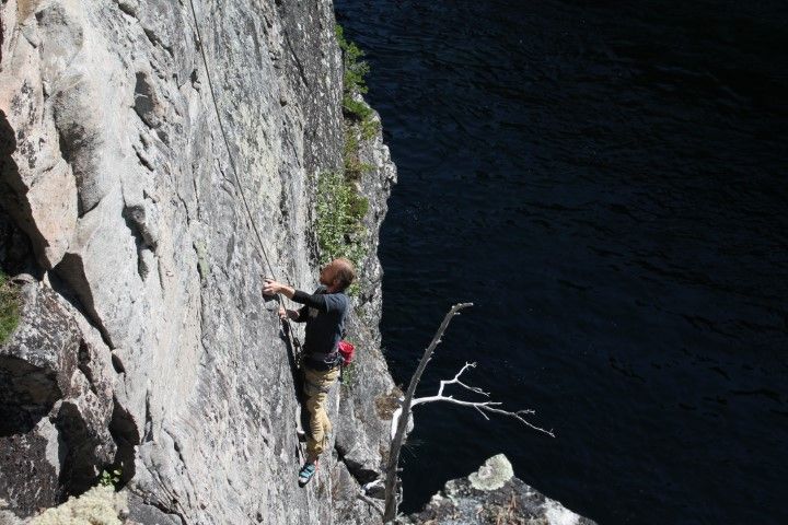 Oppdal hat neben den zahlreichen Routen, die wir schon geklettert haben noch einige, die ein bisschen spezieller sind, da man von oben abseilt und sie dann Toprope geht. Zu diesem Zwecke zeigen uns Bene und Surya noch, wie man mit einem Reverso von oben sichert und wir probieren das auch gleich aus.