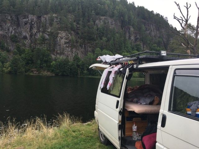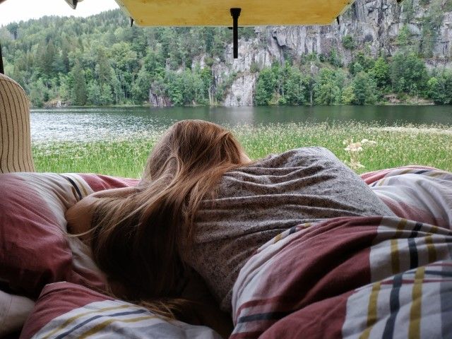Ein Ausspanntag steht am Programm. Jaci und ich lassen uns deshalb auch ewig Zeit, um aufzustehen. Wir haben den Bus mit der Heckklappe Richtung See geparkt und genießen den Ausblick vom Bett.