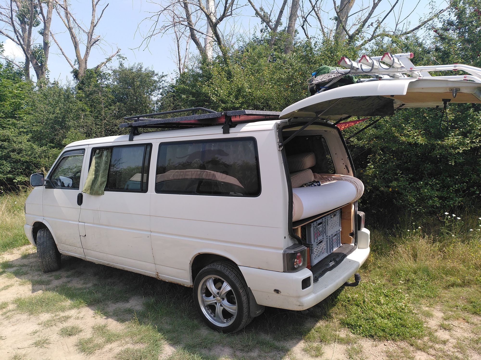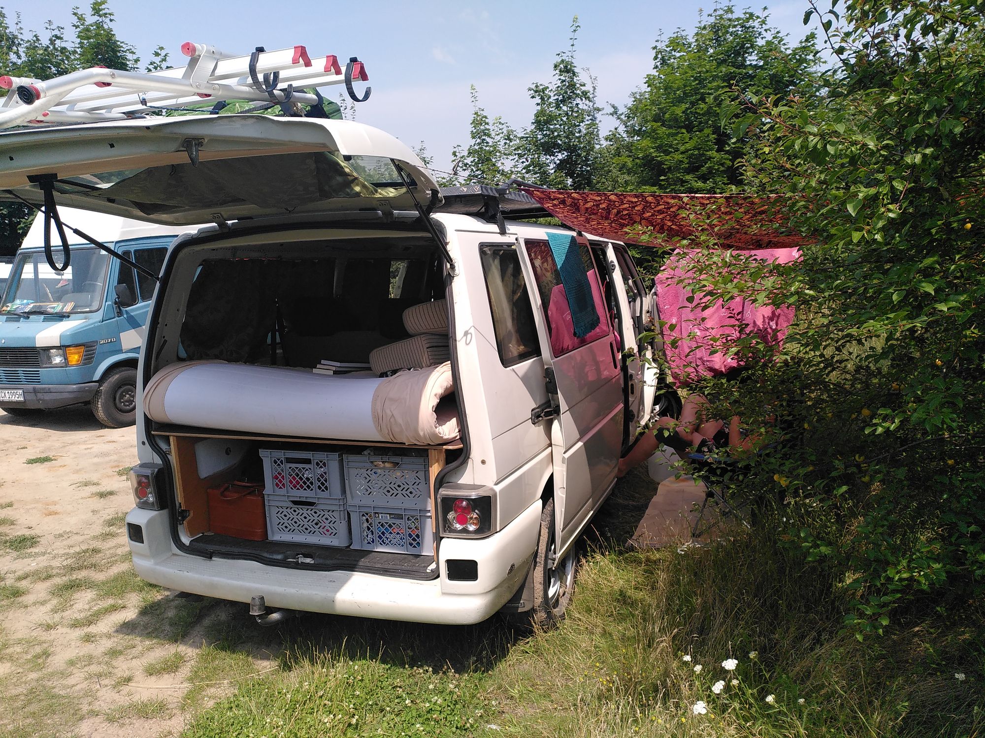 Wir planen unsere Abfahrt für 18:30 Uhr. Alles wird gepackt, alles wird bedacht und zusammengetragen, alle Lebensmittel verstaut und die Küche bestückt. Jules und Sally haben uns noch ein Zelt mitgegeben. Dieses verstauen wir gekonnt auf dem Radlträger unseres Busses. 18:30 Uhr schaffen wir dann doch nicht, weil dieses und jenes noch zu erledigen ist. 22:30 Uhr schließen wir die Heckklappe und starten endlich Richtung St. Pölten. Am Weg holen wir noch zwei Gewandbeutel von Jules und Sally, da wir die letzte Woche mit Ihnen gemeinsam verbringen werden. Dann geht’s ab nach St. Pölten. Opeth füllt noch Motoröl und Kühlflüssigkeit nach, während ich das Eine oder Andere aus- und ein paar Kleinigkeiten einlade.