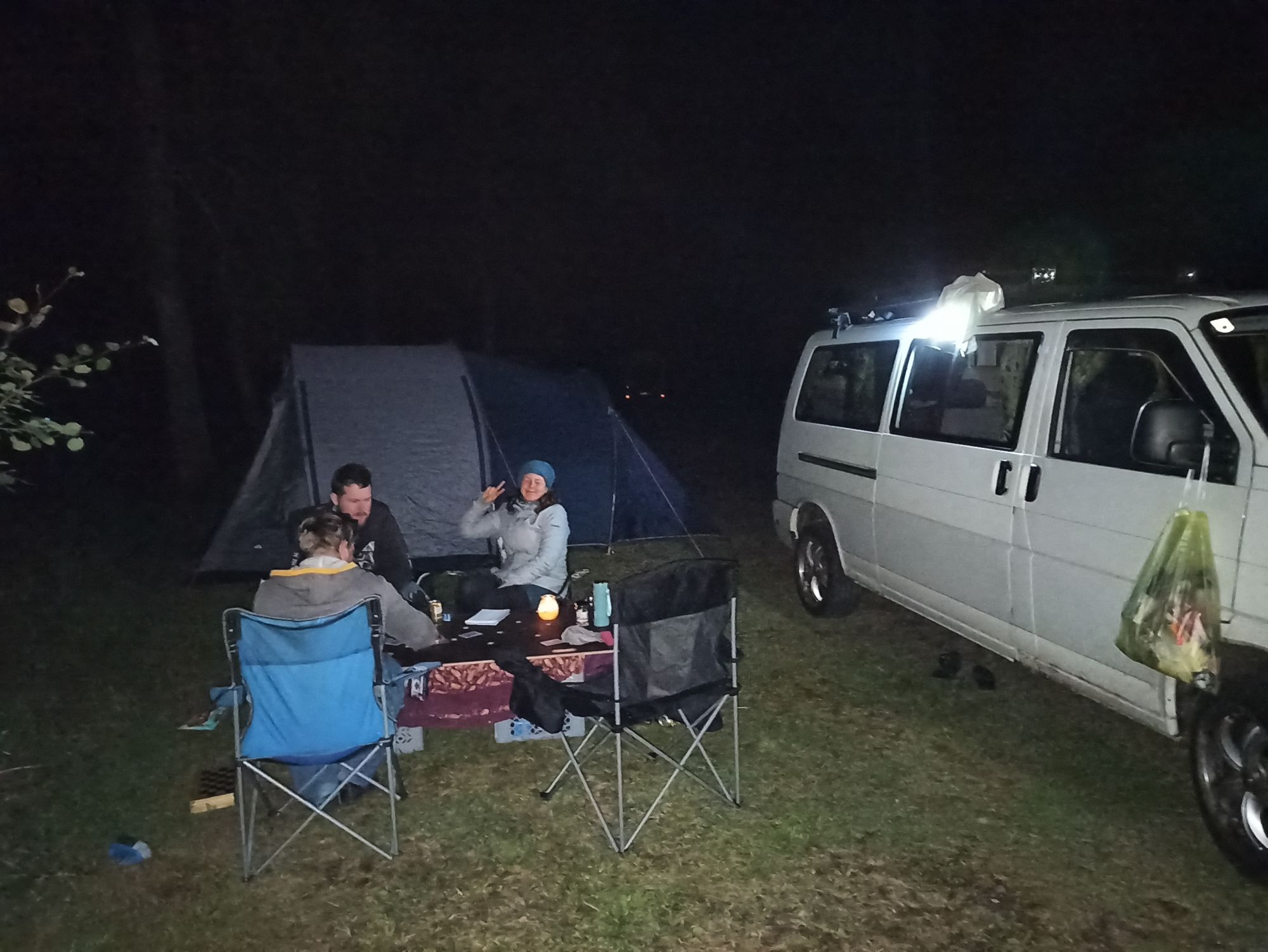 Auf dem Campingplatz ist zwar viel los, aber wir haben einen sehr schönen Platz ergattert, der es uns ermöglicht mithilfe des Busses und des Zeltes einen Bereich abzugrenzen. Aus den Kisten und der Bettplatte bauen wir einen Tisch und plaudern über die Erlebnisse der vergangenen Tage.