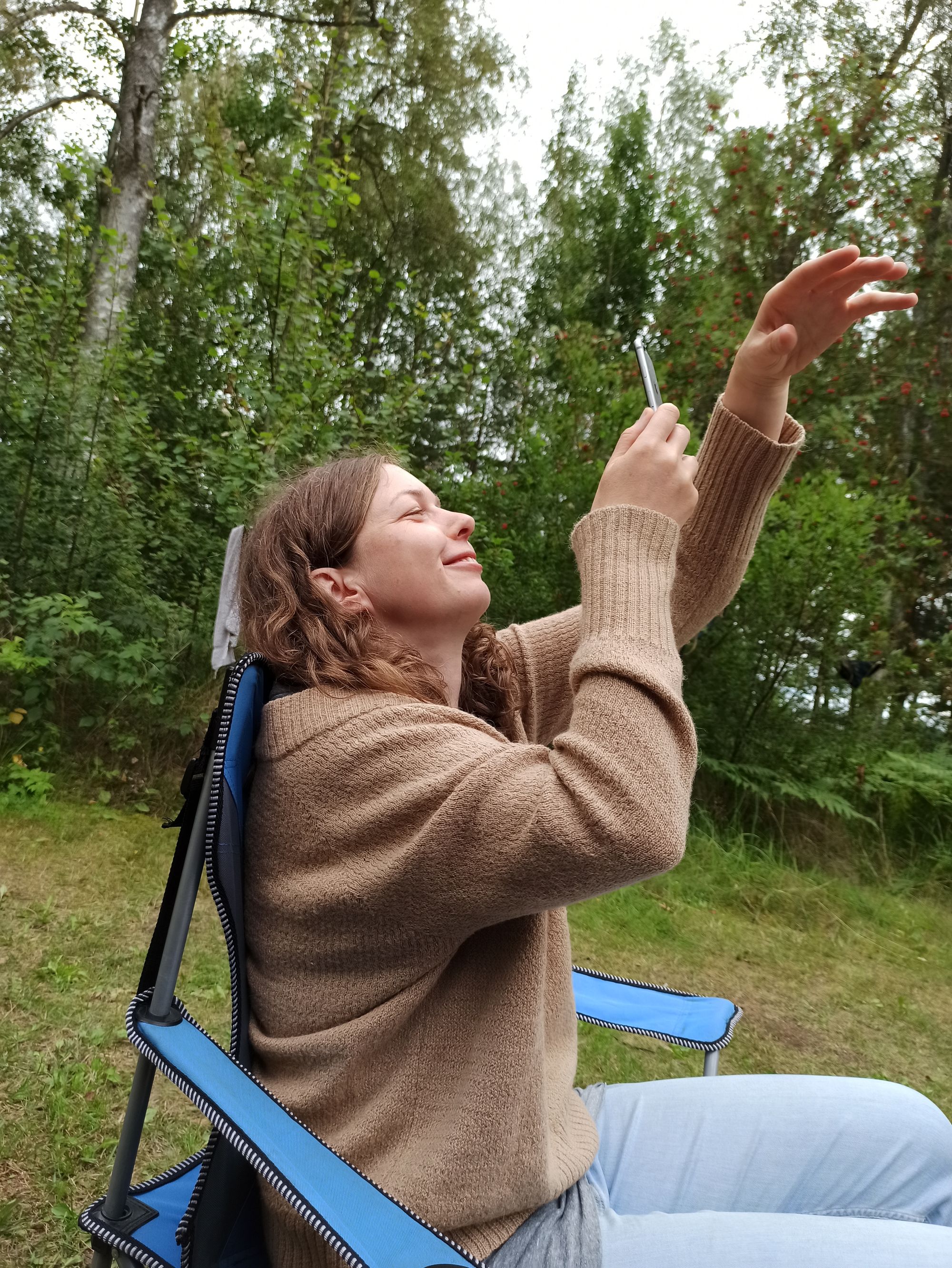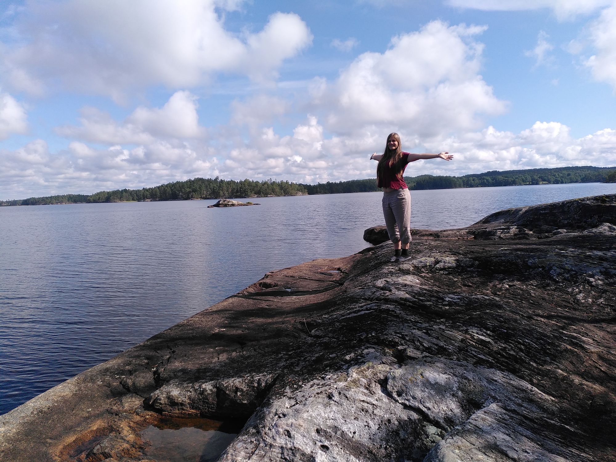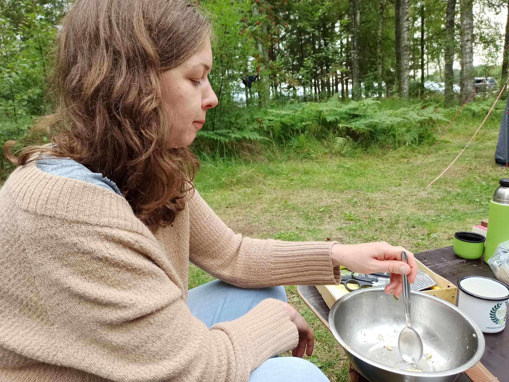 Bei dem vereinbarten Platz angekommen, bemerken wir, dass dieser voll ist. Da unsere Reisegefährten noch nicht da sind, entscheiden wir uns einen Platz am Wasser zu suchen. Diese Suche wird zu einem richtigen Abenteuer. Über Schotterwege, die immer schmäler werden und mitten im tiefsten Wald enden, bis hin zu einigen Plätzen wo nicht klar ist, ob sie privat sind, ist alles dabei. Nach circa einer Stunde Gegend-Erkunden finden wir um 17:30 Uhr einen wunderschönen Platz am Wasser. Sally und Julian haben uns während der Suche Bescheid gegeben, dass es bei Ihnen etwas länger dauert, da Sie noch tanken gefahren sind und die Tankstelle weit von der eigentlichen Route entfernt ist. Wir schicken ihnen unsere Koordinaten und springen ins Wasser. Die Zeit mit Opeth ist herrlich. Ich nutze gleich die Gelegenheit und wasche meine Haare.