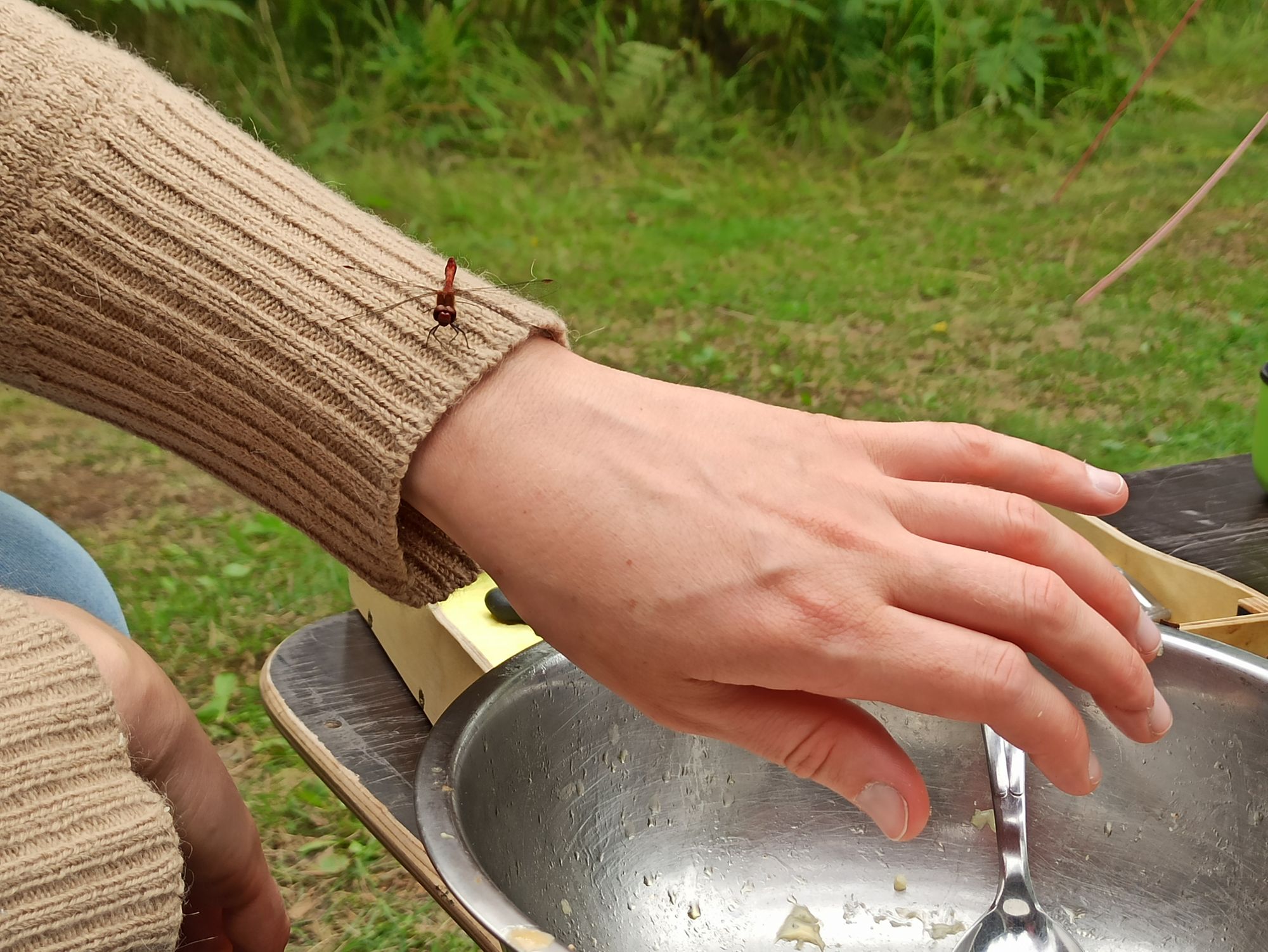 Gestern wurde es wieder lang und so schlafen wir gut aus. Am Frühstückstisch werden Müsli, Lappen und einige Reste vom Grillfeste verputzt. Wir bekommen Besuch von einer Libelle, die sich sehr gut mit Sally versteht.