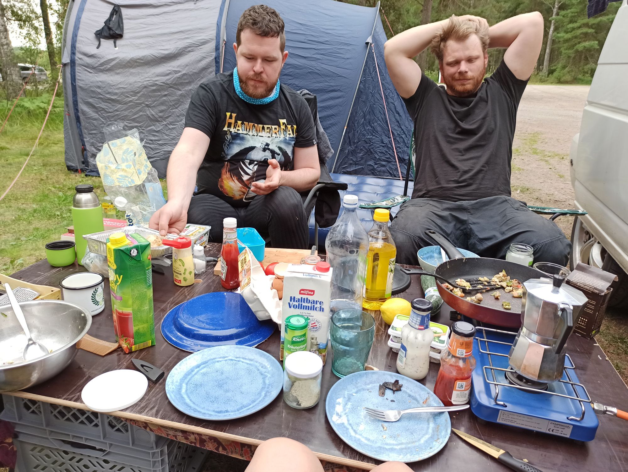 19:30 Uhr ist es, als ich die Fette Made schon von Weitem kommen sehe. Die beiden sind erledigt von der Odyssee, die sie hinter sich haben und froh endlich angekommen zu sein. Während sie das Zelt fertig aufbauen und sich einrichten, bereiten wir das Essen fertig vor. Opeth hat ein tolles Reis-Würstelgericht aus den Resten von gestern gezaubert. Aufgrund des Regens speisen wir im Bus und kommen richtig an.