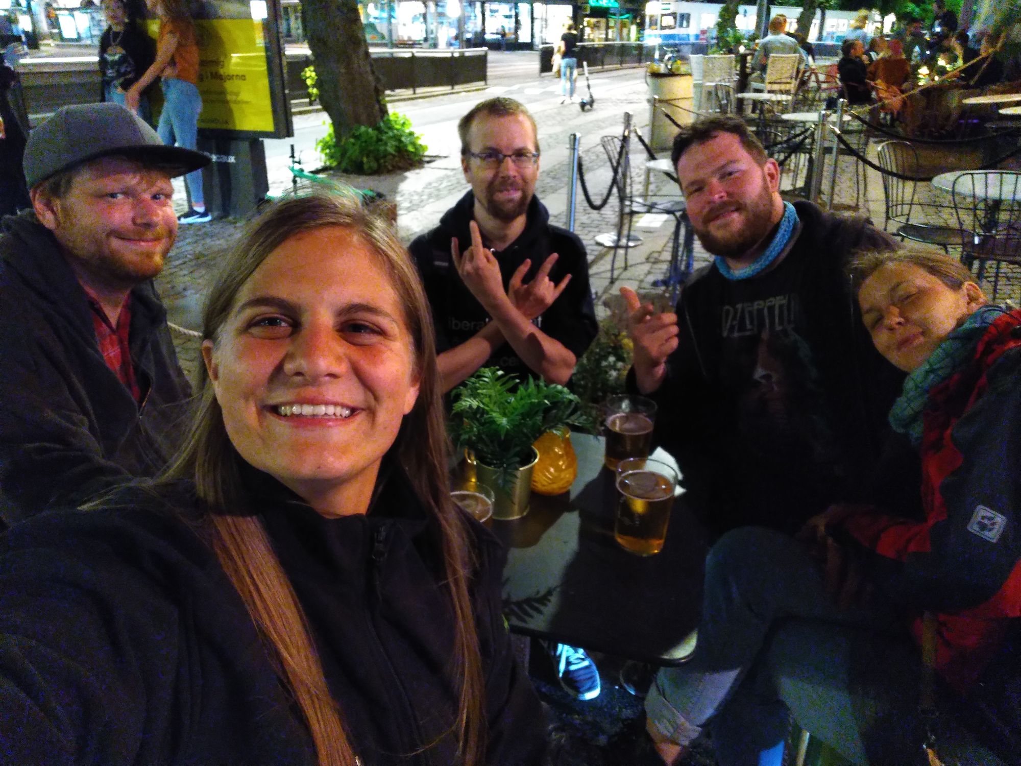 Um 18:00 Uhr kommen wir bei Hirsl in Göteborg an. Die Freude über das Wiedersehen ist groß. Er zeigt uns seine Wohnung und Sally und Julian bringen gleich ihr Zeug zum Übernachten rauf. Bereits hungrig entscheiden wir uns mit E-Scootern ins Zentrum zu fahren, um dort Essen zu fassen. Hirsl fährt mit seinem guten alten Drahtesel. Es ist schwierig das passende Restaurant zu finden. Vor allem, weil viele Küchen schon um 21 Uhr schließen. Nach längerem Hin- und Herfahren kehren wir in ein Irish Pub ein und essen Burger & co.