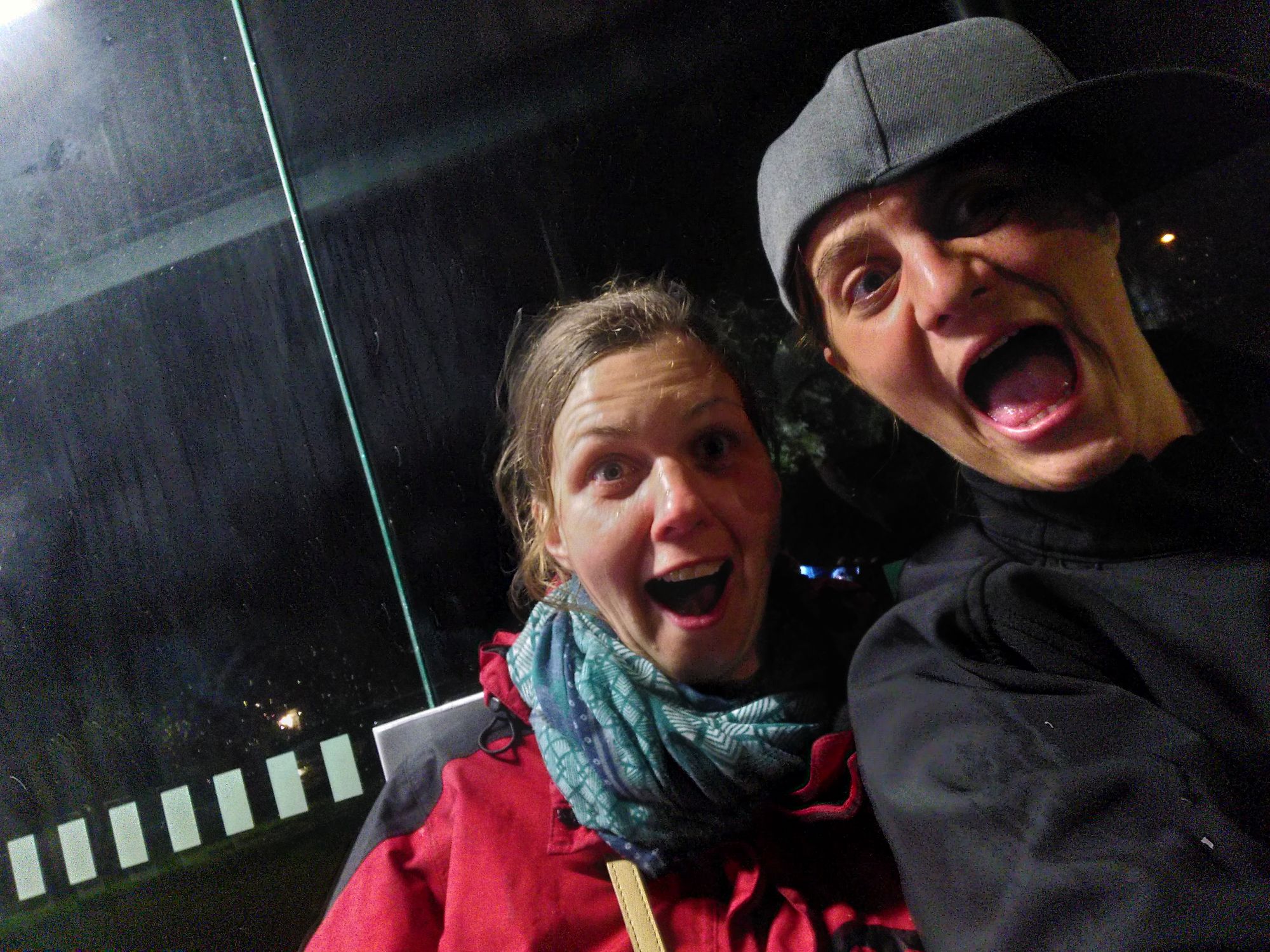 Hirsl bringt noch 6 Dosen Bier mit und auf geht’s. 2 Sekunden nach dem wir gestartet sind, beginnt ein Platzregen, wie ich ihn selten erlebt habe. In kürzester Zeit sind wir waschelnass und die Straßen voller übertrieben tiefen Lacken. Sally und ich verstecken uns hinter den Rücken unserer Jungs und wir wenden tapfer die Hüftschwungmethode an. Ich blicke zu Julian und sehe, wie ihm Wasser und Verblüffung im Gesicht steht: „Wie!? Aber wie?! Es war doch grad noch trocken“ Oh Mann dieses Bild werde ich nicht vergessen. Wir haben alle riesigen Spaß dabei. Dann plötzlich… am Horizont… sehen wir wie Hirsl in der Kurve zum Liegen kommt. Noch in der Bewegung des Sturzes schupft er sein kaputtes Fahrrad an den Randstreifen und sprintet weiter.