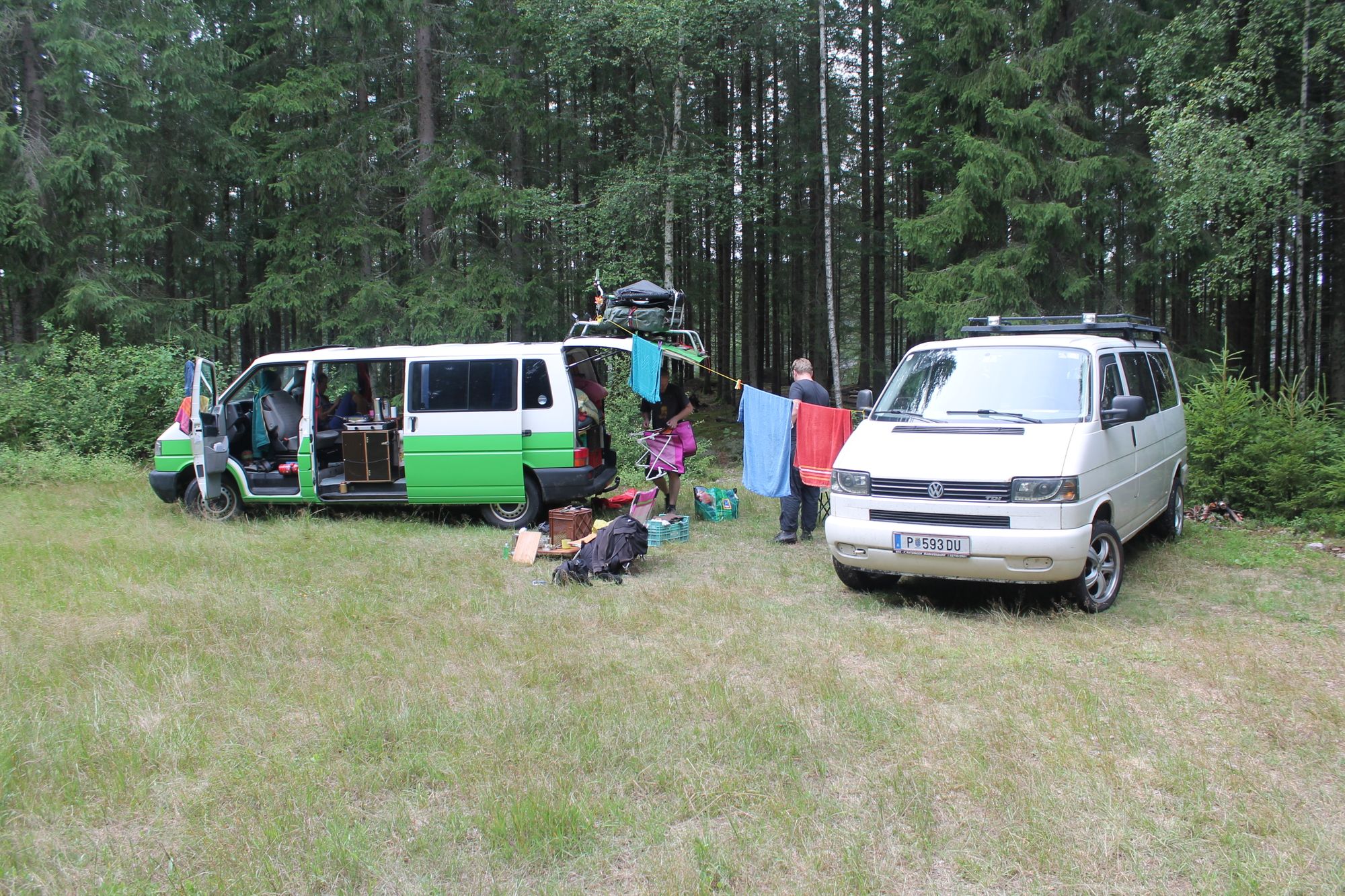 Aber solange es nur beim Autofahren regnet, soll uns das die Laune nicht verderben. Eines der Vorder und eines der Hinterlichter beim Bus sind hin und deshalb machen wir einen Zwischenstopp beim Biltema in Falköping und erstehen die benötigten Ersatzteile. Die anvisierten Plätze für die Nacht sind bereits alle vollgeparkt. Gut so! Weil nach kurzer Erkundung der Gegend, finden wir einen wunderschönen, ruhigen Platz für uns allein. Ein eigener Steg für uns ziert den See den wir be-campen und wir spannen zwischen den Bussen ein Vorzelt damit wir nicht nass werden, denn der Regen hat leider noch nicht nachgelassen.