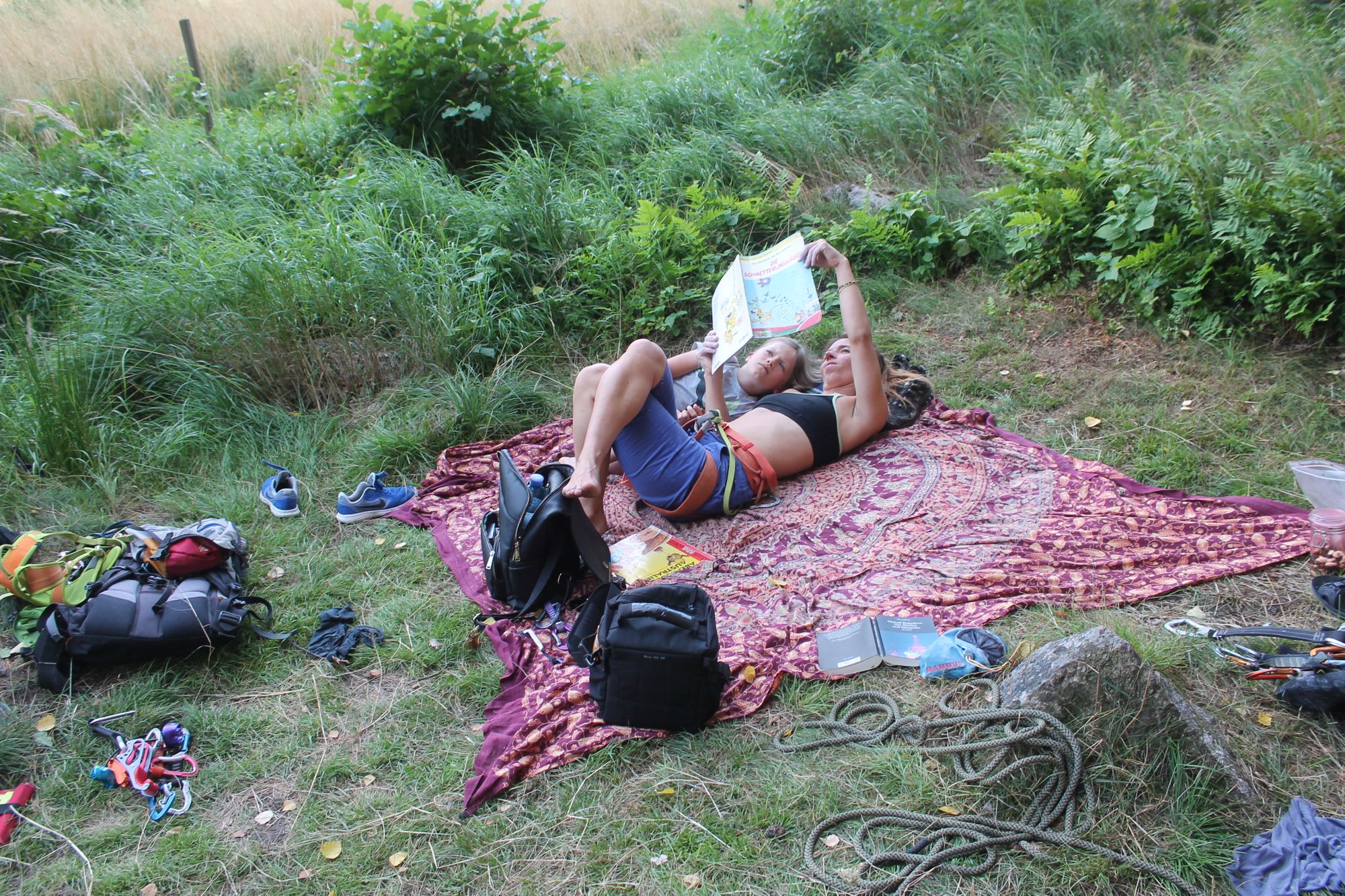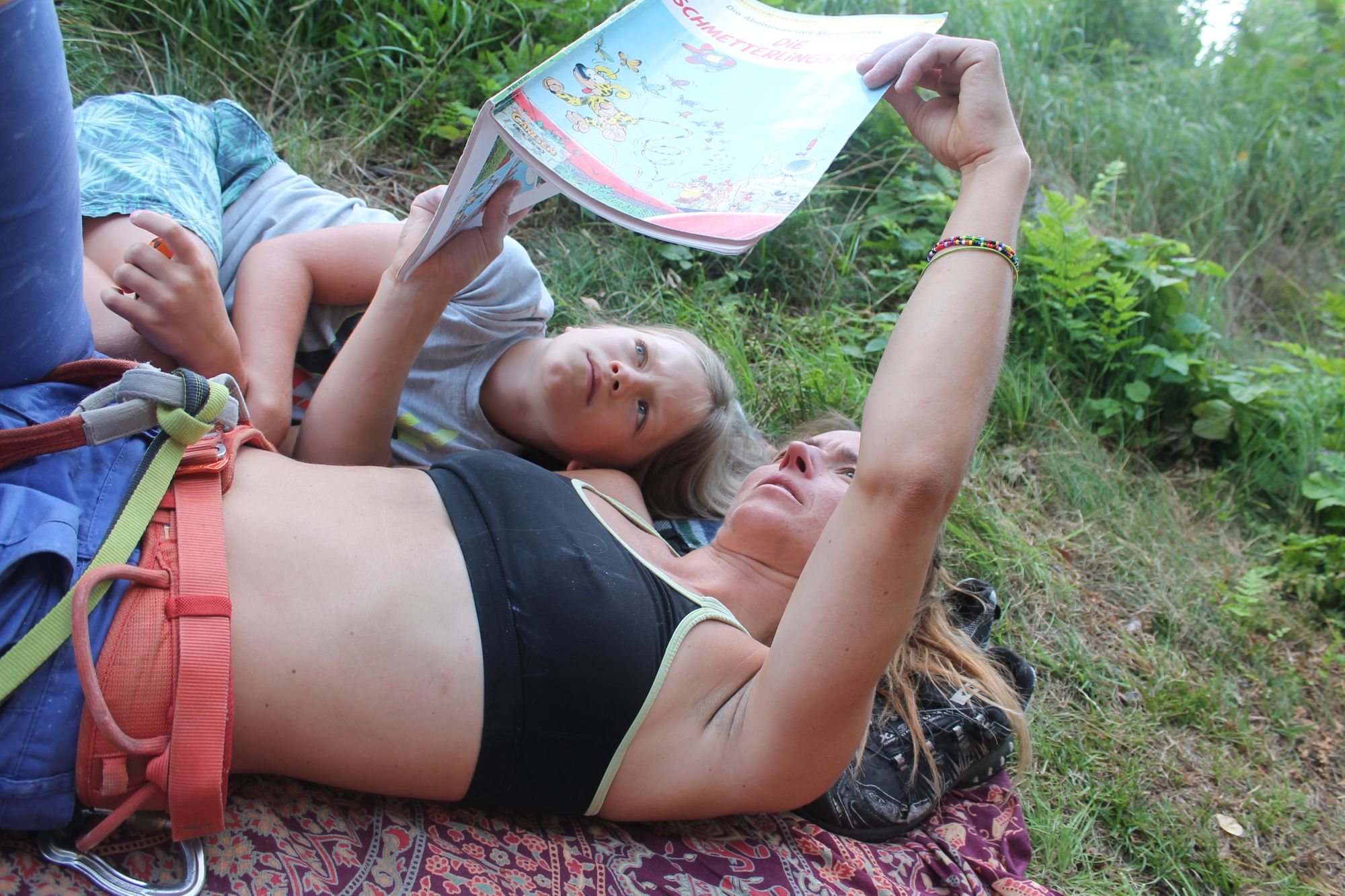 Danach fahren wir zu dem auserwählten Klettergebiet namens Nynäsklippan in Nynäs. Surya und Bene fackeln nicht lange und steigen sofort ein. Jaci und ich gehen es ein bisschen gemütlicher an und wir legen uns auf unser Tuch und relaxen erstmal. Dann lesen wir Jonathan ein Comic vor, indem wir einem aufregenden Abenteuer von Spirou folgen.